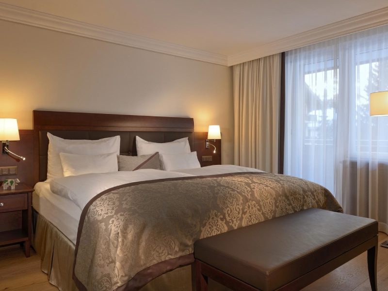 Südbalkon mit Blick auf das imposante Matterhorn. Elegante Deluxe Junior Suite mit gemütlicher Sitzecke. Badezimmer mit Badewanne, separater Dusche und abgetrenntes WC. Zusatzbett möglich.