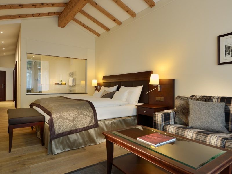 Grosszügiges Doppelzimmer mit gemütlicher Sitzecke und teilweise mit Balkon. Badezimmer mit Badewanne, separater Dusche und abgetrenntes WC.