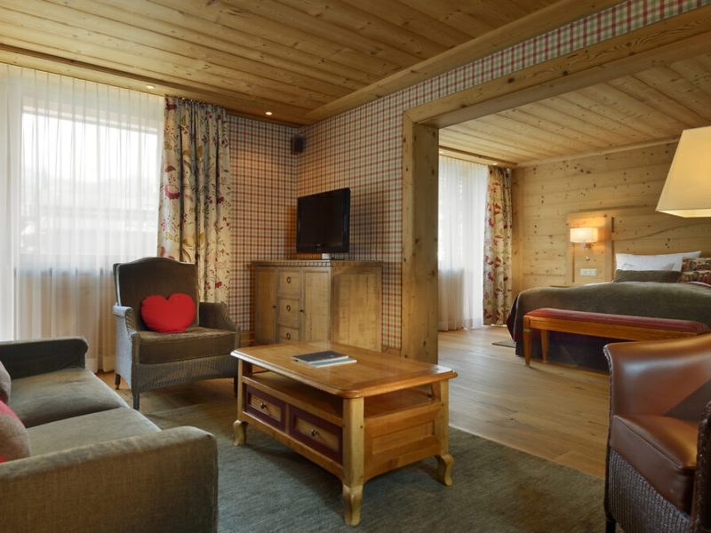 Blick auf die Zermatter Bergwelt. Gemütliches Doppelzimmer mit kleiner Sitzecke. Badezimmer mit Badewanne / Dusche und Toilette.
